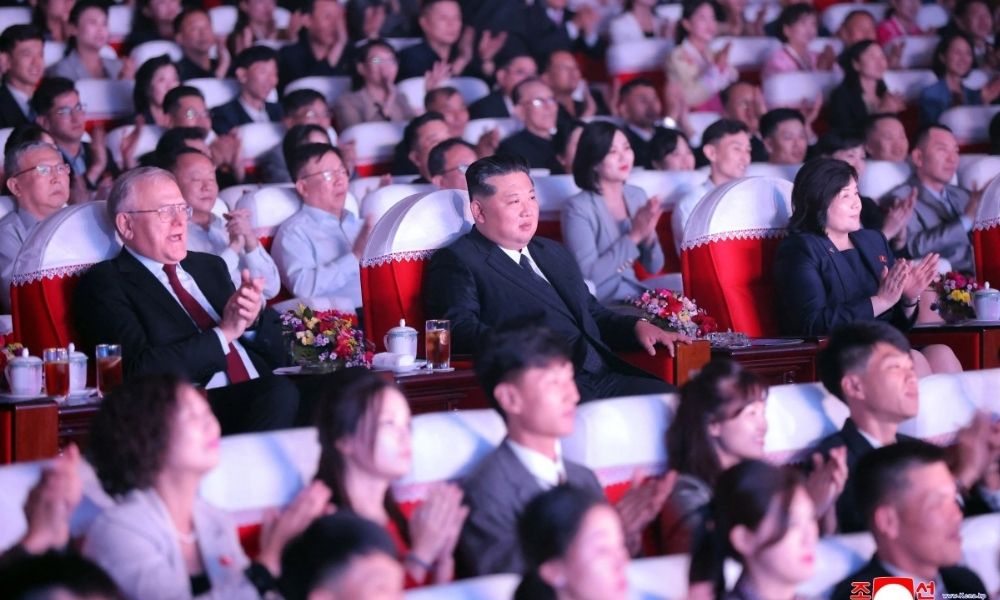 Foto tirada em 9 de outubro de 2025 e divulgada pela Agência Central de Notícias da Coreia do Norte (KCNA) em 10 de outubro de 2025 mostra o líder norte-coreano Kim Jong Un (C) assistindo a uma apresentação de artistas russos comemorando o 80º aniversário da fundação do Partido dos Trabalhadores da Coreia no Teatro de Arte Mansudae em Pyongyang